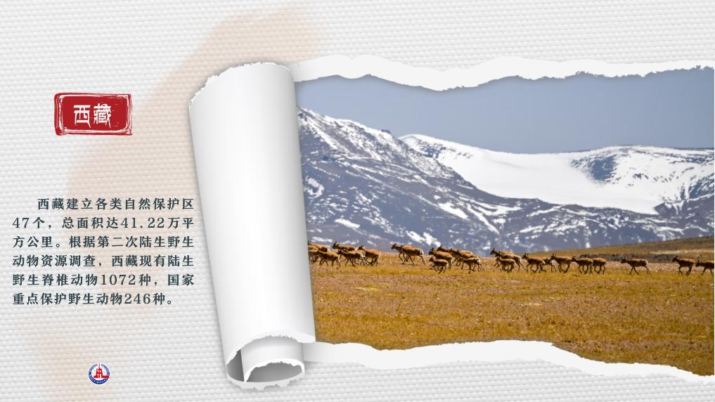 西藏建立各类自然保护区47个,总面积达41.22万平方公里。根据第二次陆生野生动物资源调查,西藏现有陆生野生脊椎动物1072种,国家重点保护野生动物246种。