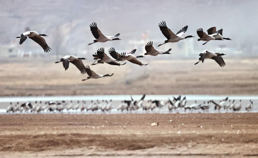 这是3月8日在拉萨市林周县虎头山水库拍摄的黑颈鹤。新华社记者 丁增尼达 摄