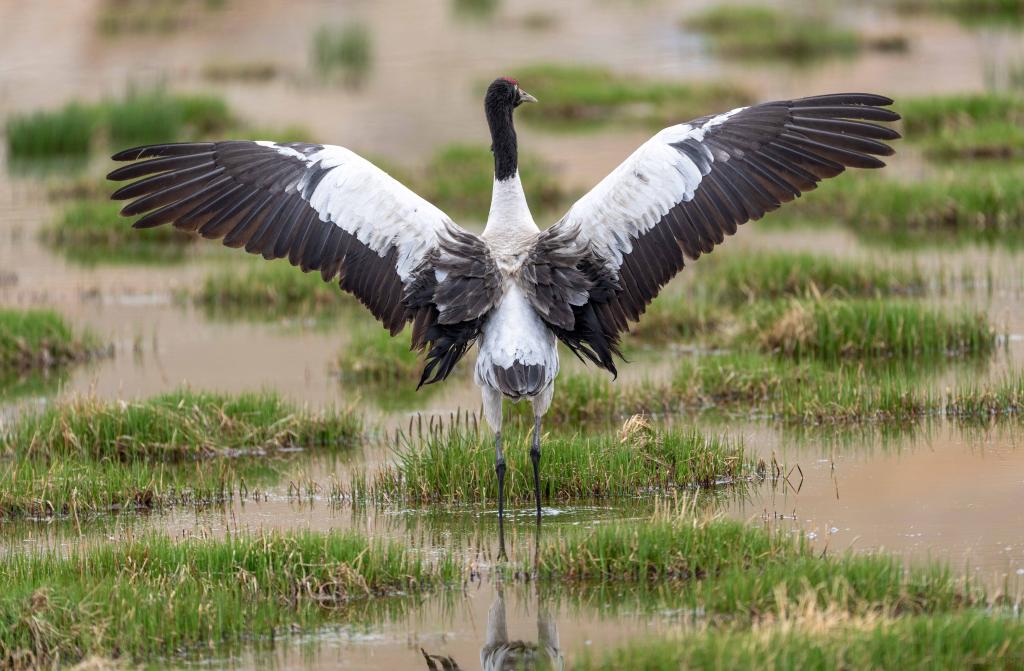 6月4日拍摄的在那曲市申扎县周边湿地里栖息的黑颈鹤。新华社记者 旦增尼玛曲珠 摄