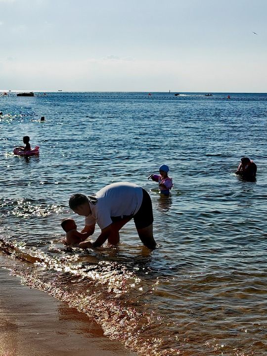 在雨天,垂钓者们面向大海,岿然不动;青年挽起裤腿,沿着滨海步道,冒雨锻炼。晴天时,海岸上尤其热闹。骑单车的少女,裙角飞扬。买完菜的老人正提着菜篮,静坐观海。海水浴场里,有人把身体埋进细沙里,闭目享受日光浴;有人抱着牙牙学语的婴孩,小心翼翼又满眼幸福地戏水。