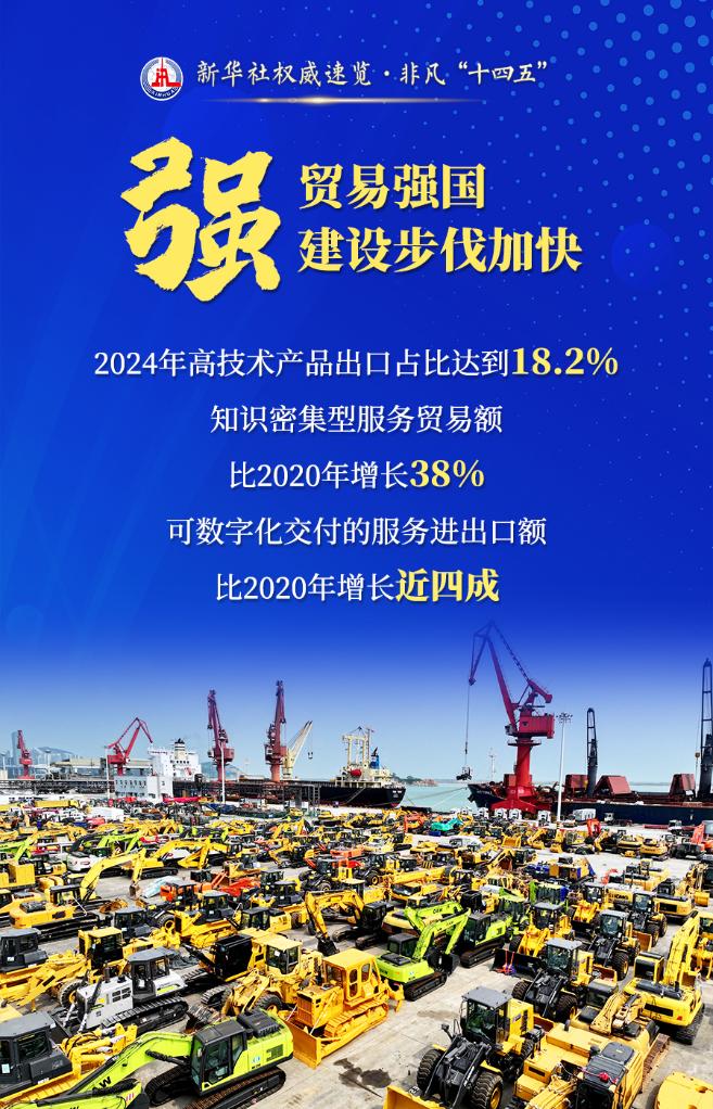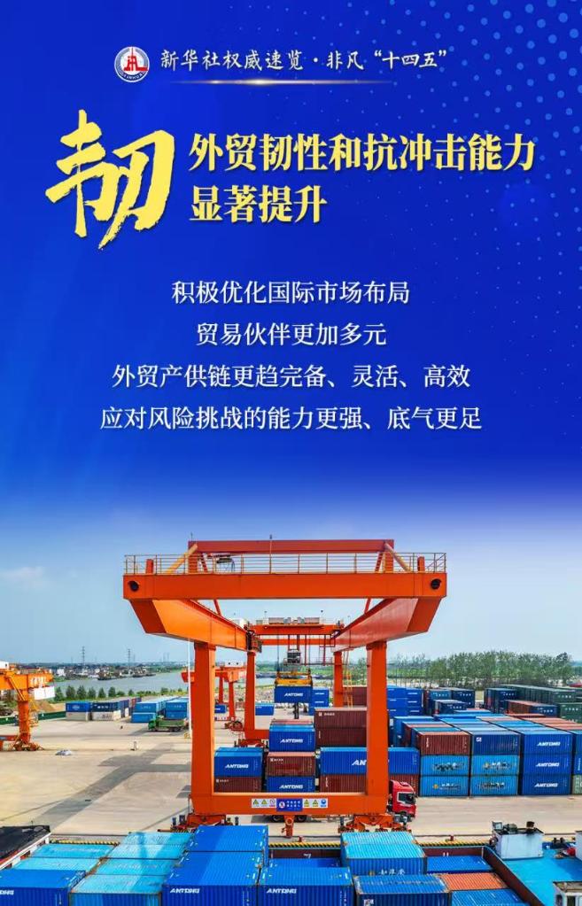 “十四五”期间,我国外贸实现逆势增长,贸易强国建设取得积极成效。商务部部长王文涛18日在国新办举行的“高质量完成‘十四五’规划”发布会上,用“大”“强”“韧”三个关键字,概括了我国贸易强国建设“成绩单”。跟随海报,一起看看吧。
