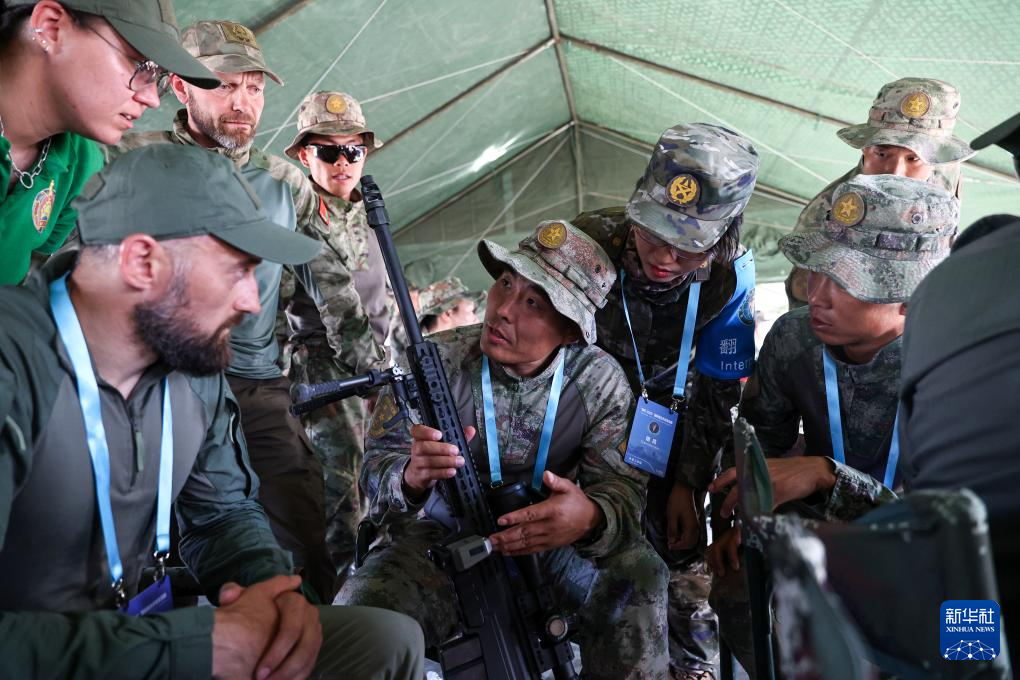 7月19日,“锋刃-2025”国际狙击手射击竞赛在新疆乌鲁木齐武警部队某训练基地落下帷幕。这是中国队员和白俄罗斯队员7月17日在交流武器装备性能。新华社发(侯崇慧 摄)