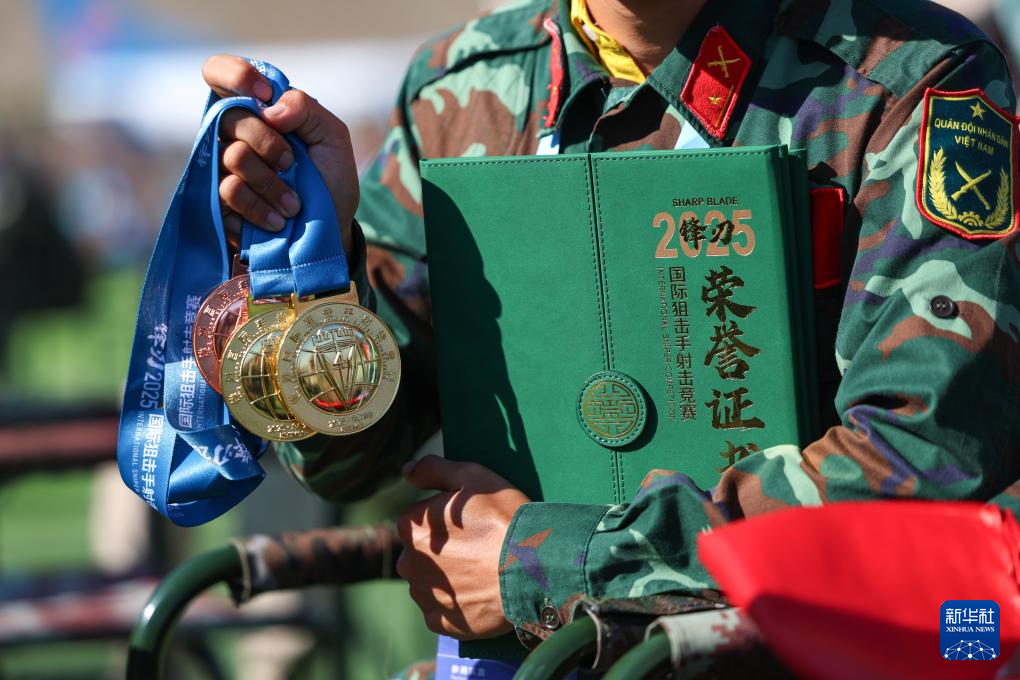 7月19日,“锋刃-2025”国际狙击手射击竞赛在新疆乌鲁木齐武警部队某训练基地落下帷幕。这是参赛队员展示获奖证书和奖牌。新华社发(侯崇慧 摄)
