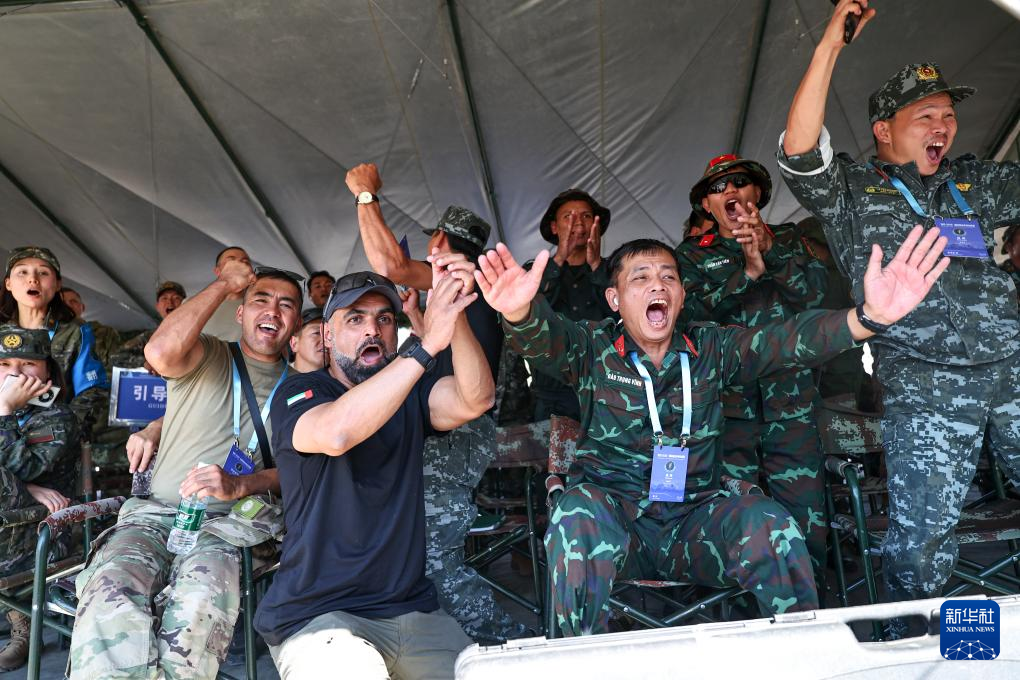 7月19日,“锋刃-2025”国际狙击手射击竞赛在新疆乌鲁木齐武警部队某训练基地落下帷幕。这是各国参赛队员7月18日为比赛中取得好成绩的队友欢呼庆祝。新华社发(侯崇慧 摄)