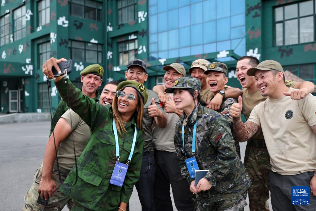 7月19日,“锋刃-2025”国际狙击手射击竞赛在新疆乌鲁木齐武警部队某训练基地落下帷幕。这是参赛队员7月18日在休息区自拍留念。新华社发(侯崇慧 摄)