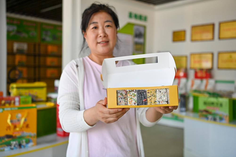 在山西省吕梁市兴县晋绥黄河湾农业科技股份有限公司,工作人员展示一款杂粮产品(7月1日摄)。新华社记者 杨晨光 摄