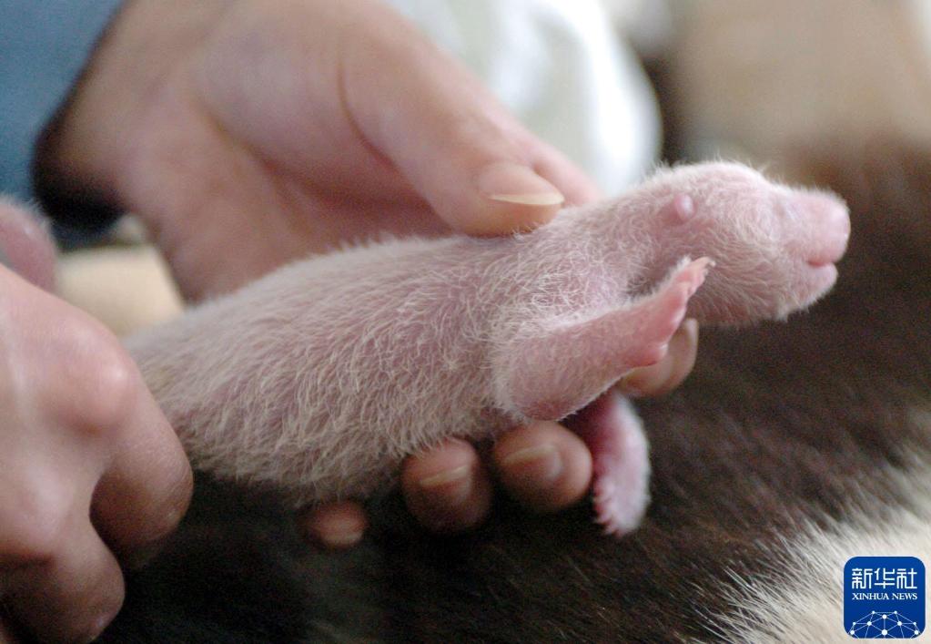 2005年7月7日,四川卧龙中国保护大熊猫研究中心的工作人员正为大熊猫“英英”的幼崽进行护理。