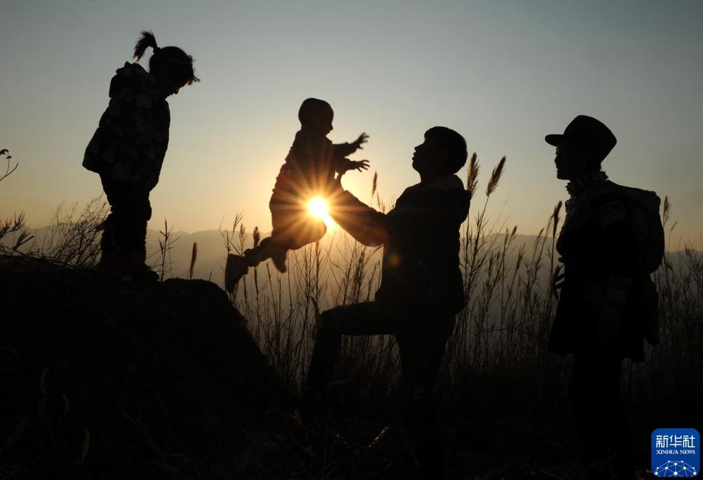 吉仕日出和妻子格吉莫沙子同孩子们在一起(2017年2月12日摄)。2016年,陷入困难的日出和沙子一家被当地政府确定为精准扶贫对象,国家为他们提供了3.5万元建房补贴款和3万元低息贷款。春节前,一家人从当年日出修的那间房子中搬进了新家。