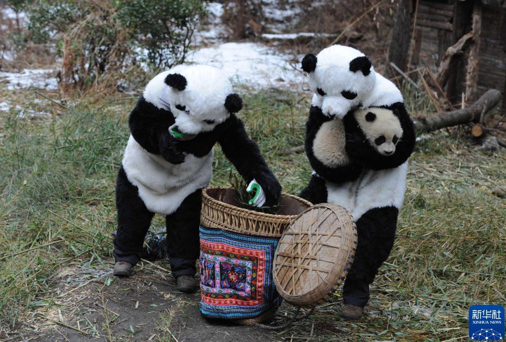 四川卧龙中国保护大熊猫研究中心的工作人员准备将野化的大熊猫放置到野化训练场(2011年2月20日摄)。