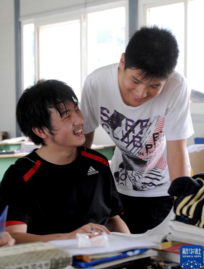 2009年5月5日,在北川中学长虹临时校区,“吊瓶男孩”李阳和“夹缝男孩”廖波(左)在教室里交谈。