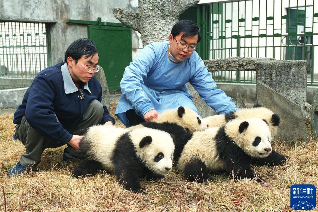 被列为世界珍稀保护动物的中国大熊猫,在育幼技术上取得重大突破,自1998年以来,中国保护大熊猫研究中心人工抚育的幼仔成活总数已达到14只。图为该中心的技术人员与大熊猫幼仔在一起。(2000年5月24日发)