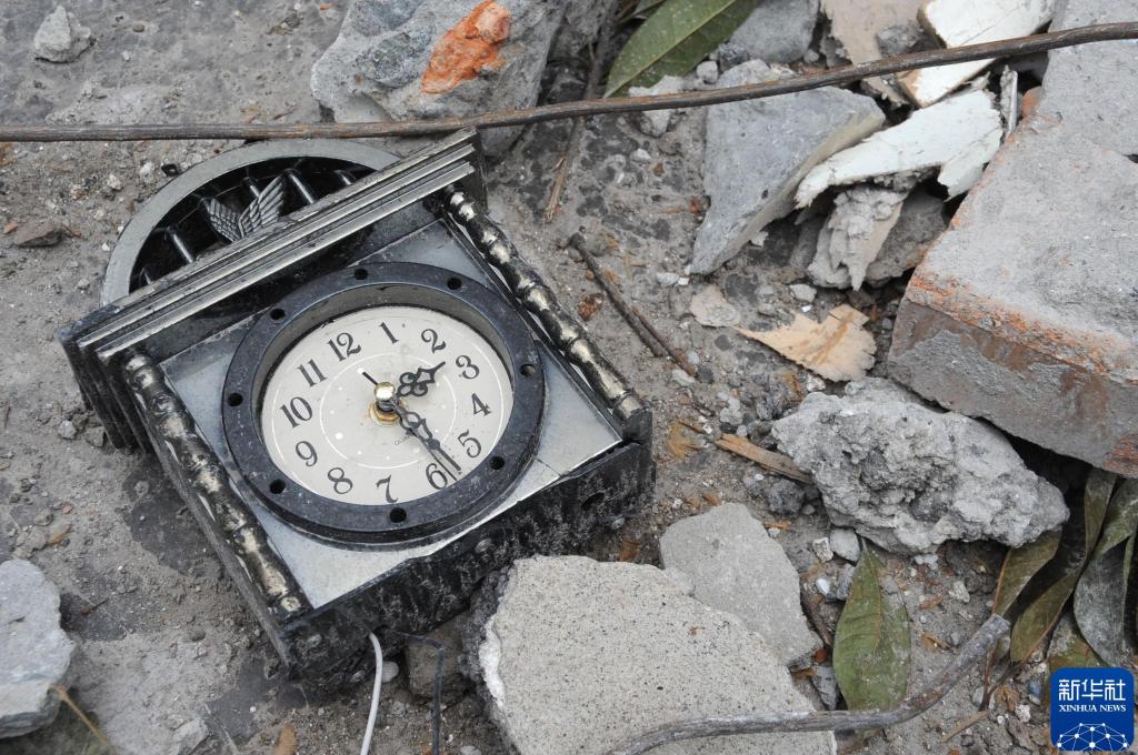 2008年5月18日,汶川大地震灾区都江堰的一处废墟,一个时钟永远将时间定格在14时28分。