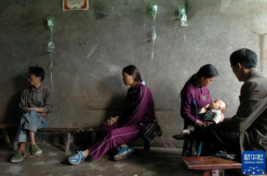 2004年9月16日,几位生病的群众正在五宝镇一个临时医疗点里输液。四川省宣汉县天台乡由于连日暴雨,2004年9月6日午夜发生特大滑坡,2.3万多人受灾,1.8万间房屋垮塌。2.3万名群众当晚实现安全大转移,创造出无1人伤亡的奇迹。