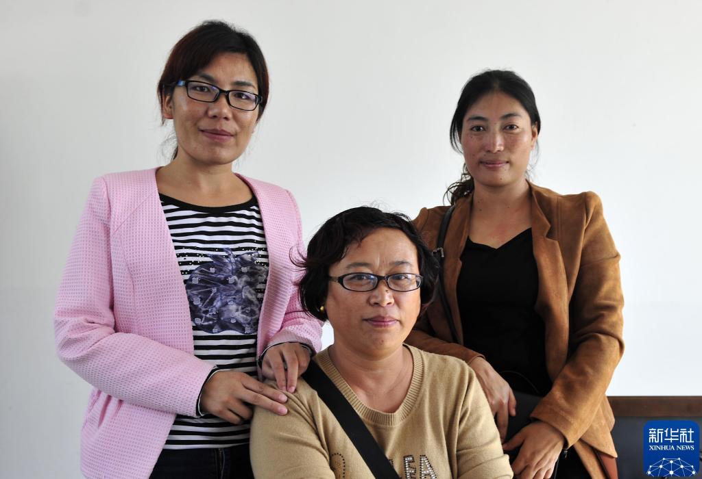 彝族老师沙诺(左)和护士日立(右)与当年的女子班老师金华英在一起(2016年10月20日摄)。沙诺和日立1992年就读于东山乡中心学校女子班。