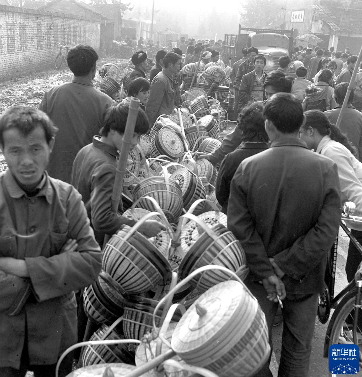 1987年12月,在成都市崇庆县道明乡农贸市场,我用一部老式双镜头相机,拍摄了入职新华社后的第一张发稿照片:熙攘的人流、沿路排开的家用竹器具……正是改革开放后乡村市场兴旺的缩影。