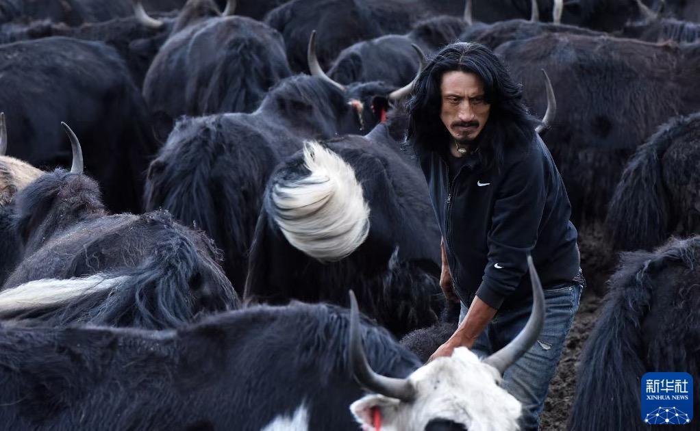 2022年7月13日,川西高原若尔盖县巴西镇班佑村远牧点,牧民巴周正在给牦牛分栏。