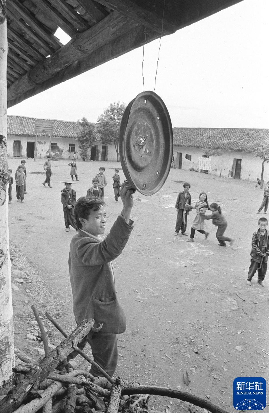 老师敲击挂在屋檐下的汽车轮毂,召唤孩子们上课。(1992年10月1日发)