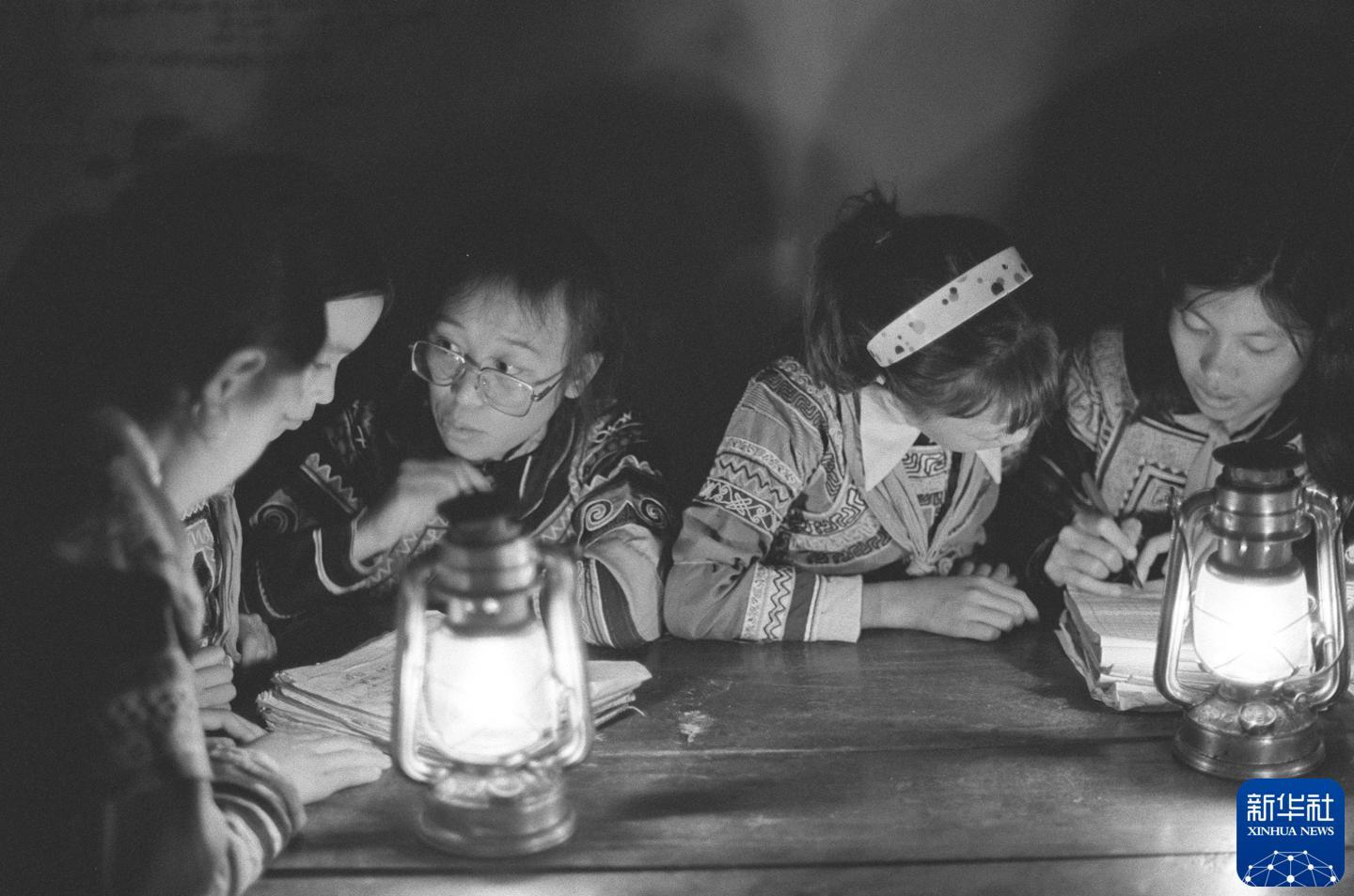 偏远的东山乡当时还未通电。入夜,老师在马灯下辅导学生功课。(1992年10月1日发)