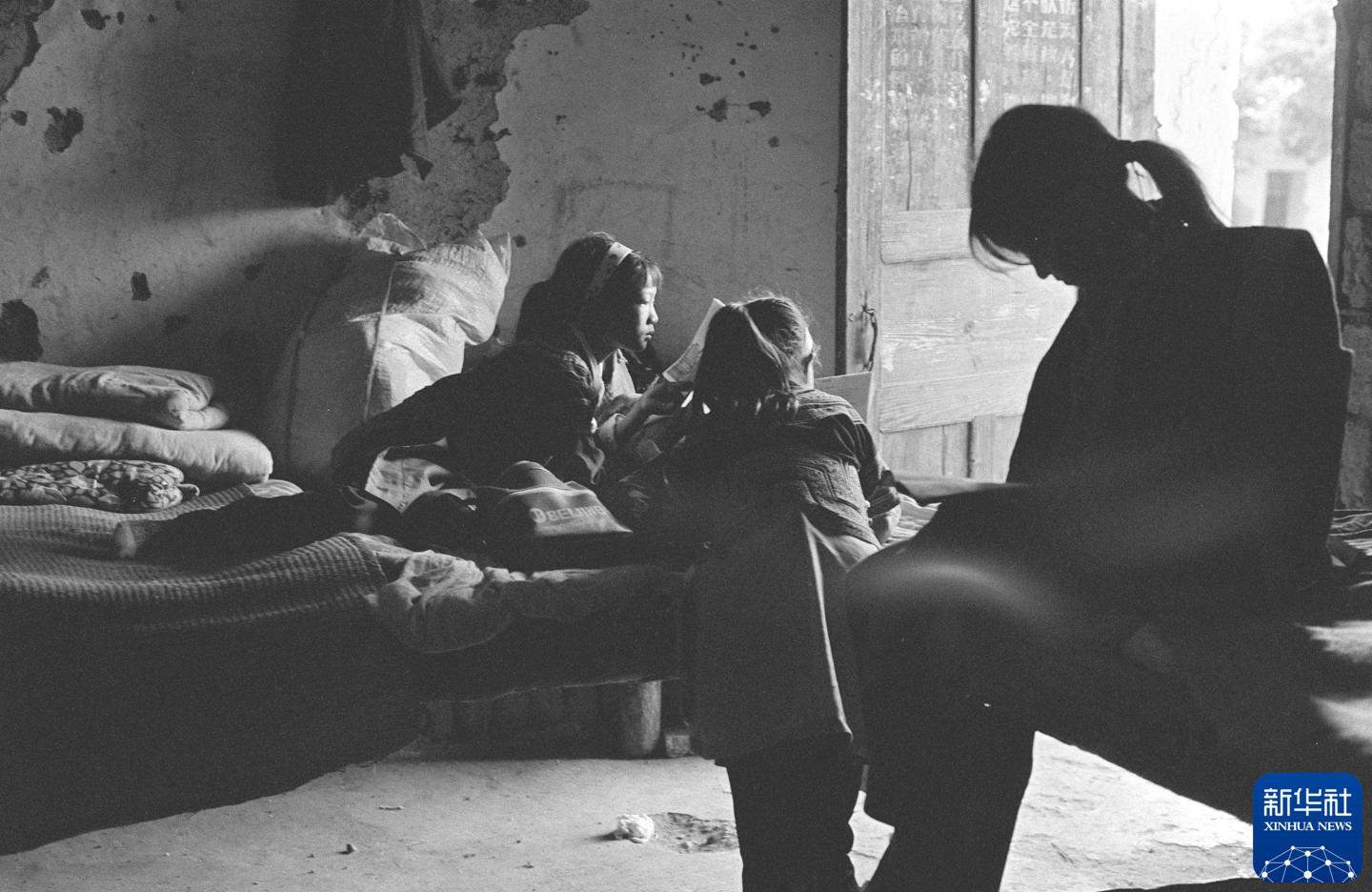 孩子们就着门口的光线看书。(1992年10月1日发)