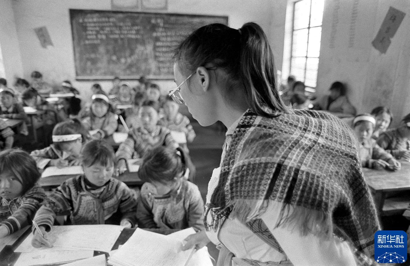 1992年9月,东山乡中心学校女子班老师金华英背着不到半岁的孩子,给学生们上课。