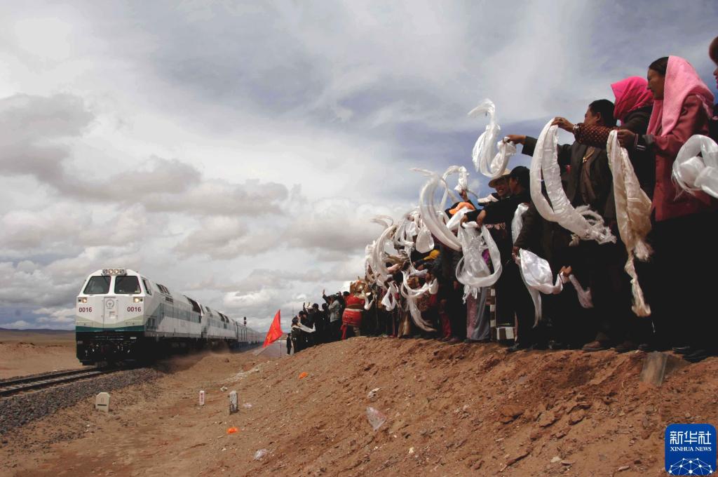 2006年7月1日,青藏铁路全线通车。在沱沱河大桥桥头,当地群众欢迎从格尔木出发的“青1”次列车。