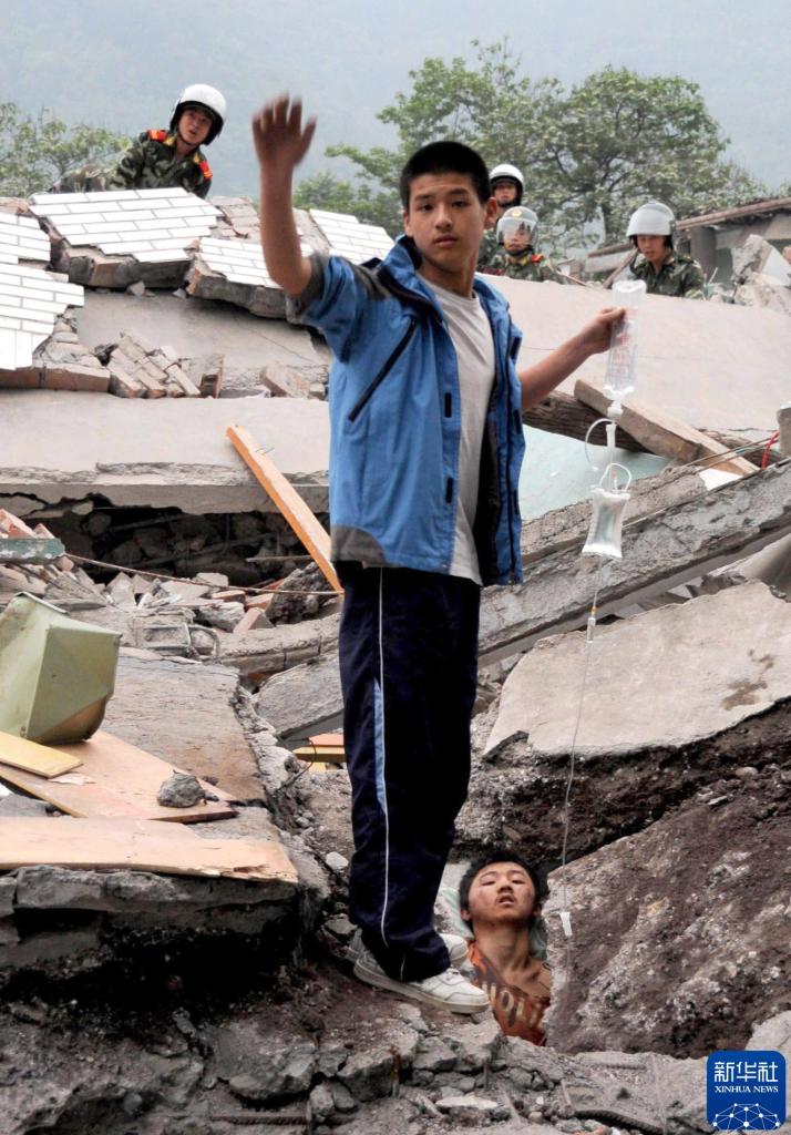 2008年5月13日,在四川北川县地震灾区,北川中学学生李阳在帮助压在废墟下的同学廖波输液,直到廖波成功获救。