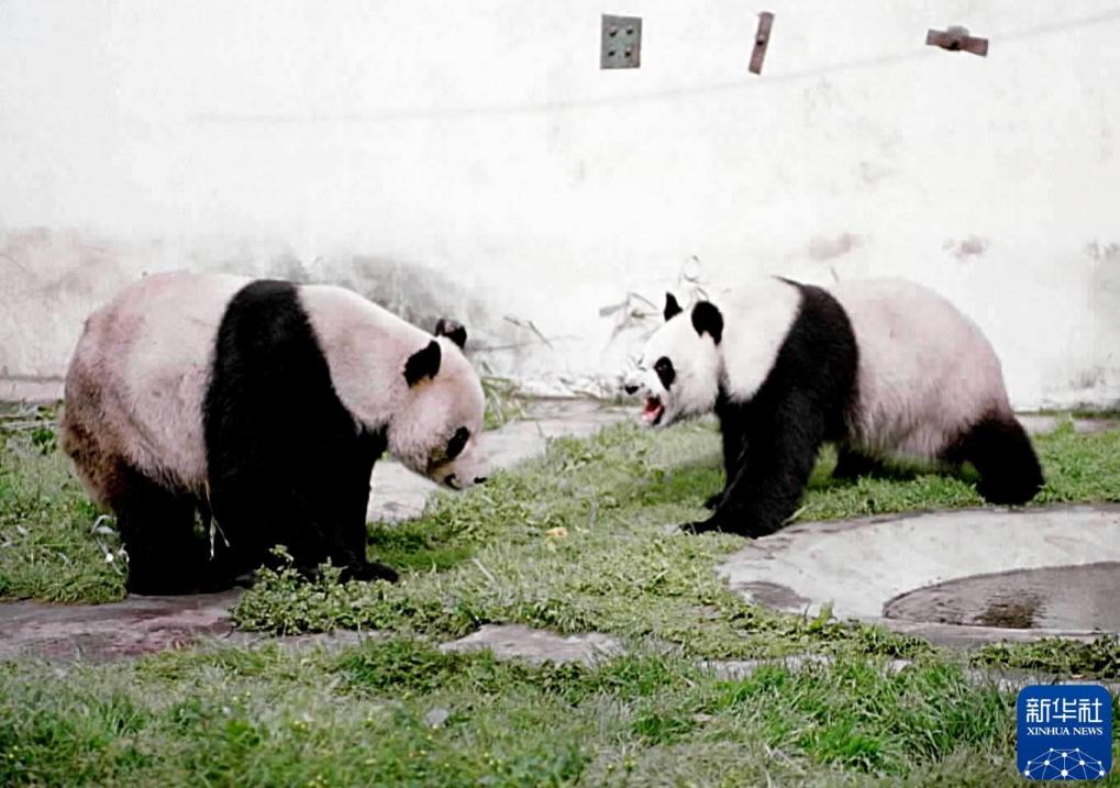 雌性大熊猫“白雪”(右)在交配过程中冲着比它重约40公斤的雄性大熊猫“大地”狂暴地吼叫,而向来性情暴躁的“大地”此时却格外驯顺。(2001年7月25日发)