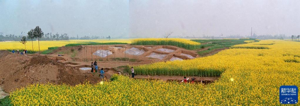 这是三星堆遗址东面城墙发掘现场。图中的高坡地(右方种有小麦之处),即为现在残存的城墙。(1989年5月27日发)。来自四川省文物考古研究所三星堆遗址发掘现场的最新消息表明:一些专家学者四年多前提出的三星堆遗址周围的“土埂”可能是古蜀都城城墙的推测,已经得到初步证实。