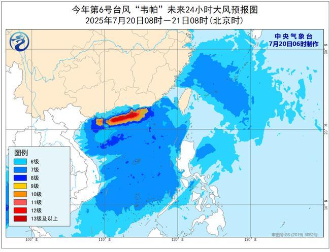 大风预报:7月20日08时至21日08时,受“韦帕”和西南季风的共同影响,南海大部、东沙群岛、西沙群岛、南沙群岛、中沙群岛、海南岛沿海、福建沿海、浙江沿海、巴士海峡、台湾以东洋面、东海大部将有6~7级风,阵风8~9级,南海北部、广东南部及沿海、珠江口区、香港、澳门、雷州半岛及其沿海、广西沿海、北部湾的风力可达8~11级,阵风12~13级,台风中心经过的附近海域和地区的风力有12~14级,阵风15~16级。