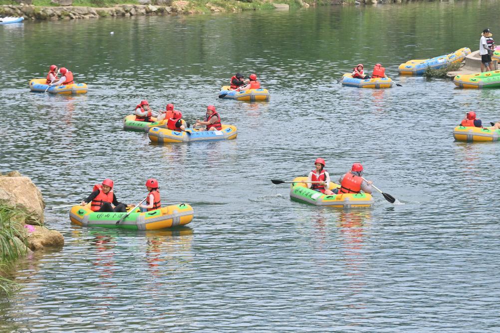 游客在融水苗族自治县香粉乡雨卜村漂流消暑(7月20日摄)。新华社记者 黄孝邦 摄