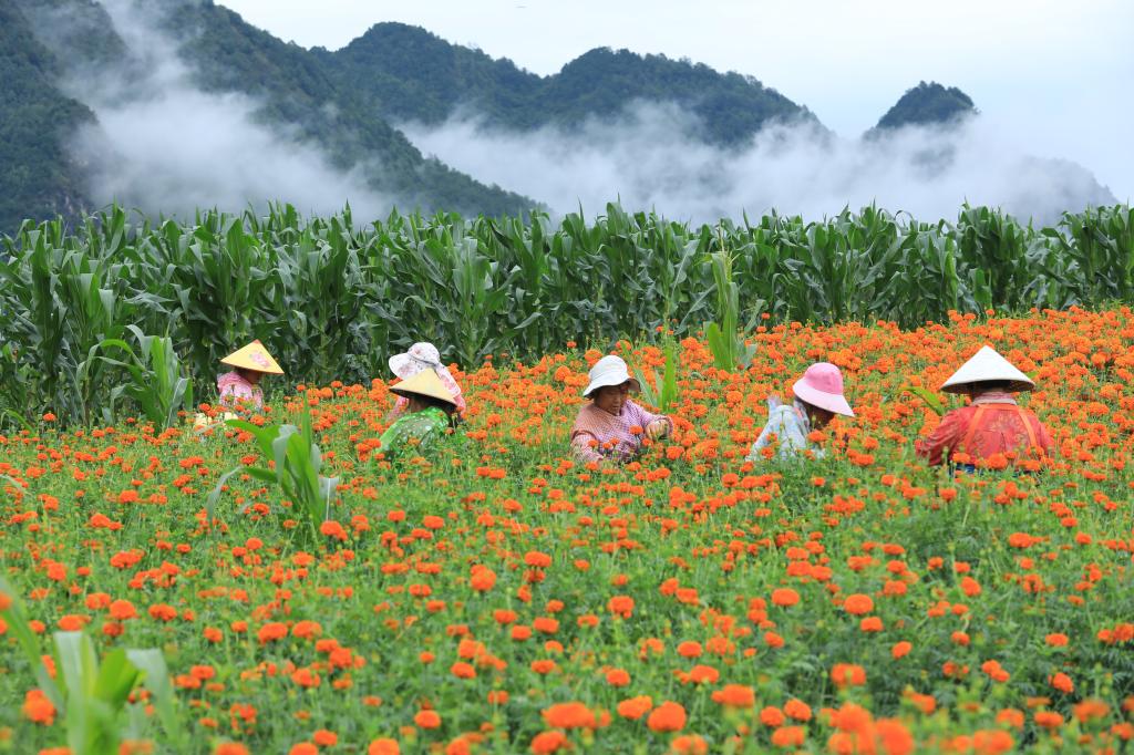 7月21日,云南腾冲市固东镇农民在凤凰山采收万寿菊。大暑到来之际,各地农民抢抓农时开展农业生产。新华社发(龚祖金摄)