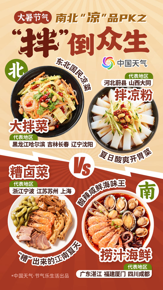 今天(7月22日)我国正式进入大暑节气,三伏天的大幕也已拉开。这一时节,北方“烧烤”、南方“焖蒸”,炎热感仿佛已经渗透进了我们的每一个毛孔。此时,南北方的餐桌放下了咸甜之争,消暑的“凉”品成为了大家共同追求。北方的凉皮、冷面、老刨冰……南方的凉面、拌粉、清补凉……这一口口凉的、酸的、辣的,是中国人对抗暑气的兵法,更是烟火人间里长出的活色生香。