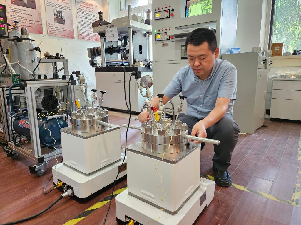 同济大学土木工程学院特聘教授张丰收正在实验室检查反应釜。 新华社记者 王默玲 摄