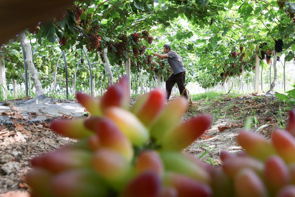 7月21日,果农在江苏省淮安市洪泽区蒋坝镇采摘葡萄。新华社发(万震摄)
