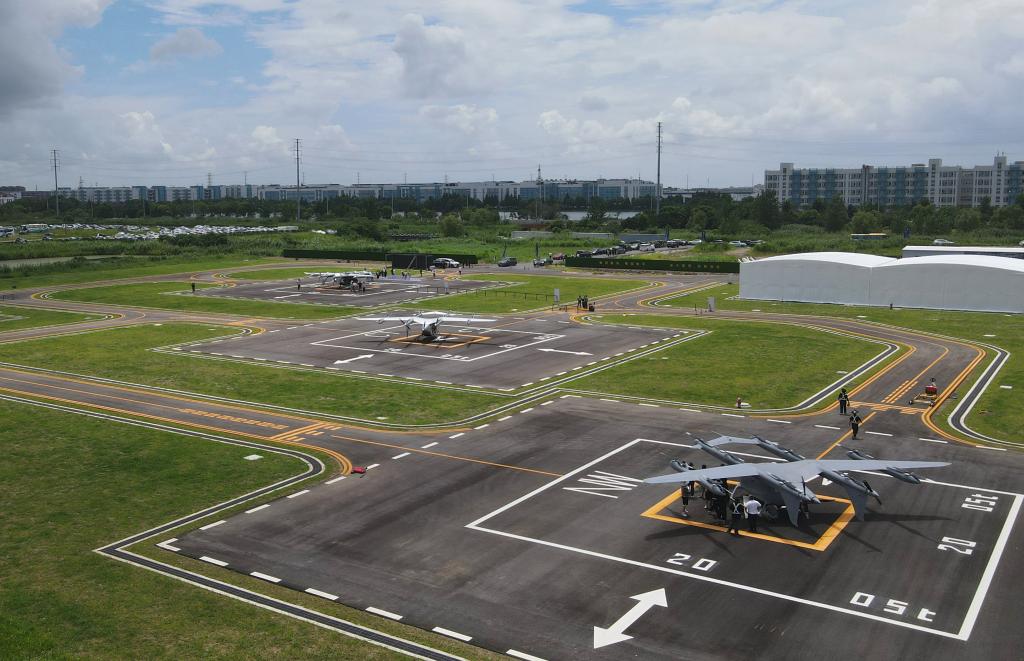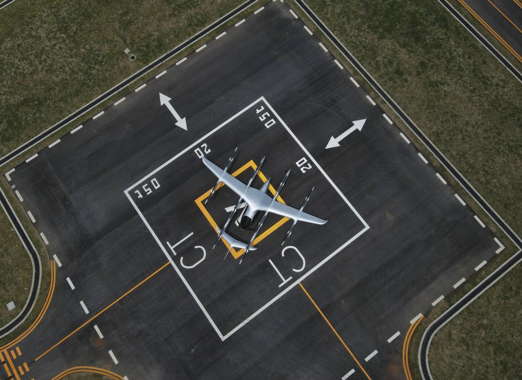 空中俯瞰停在机坪上的V2000CG凯瑞鸥电动垂直起降航空器(7月22日摄,无人机照片)。