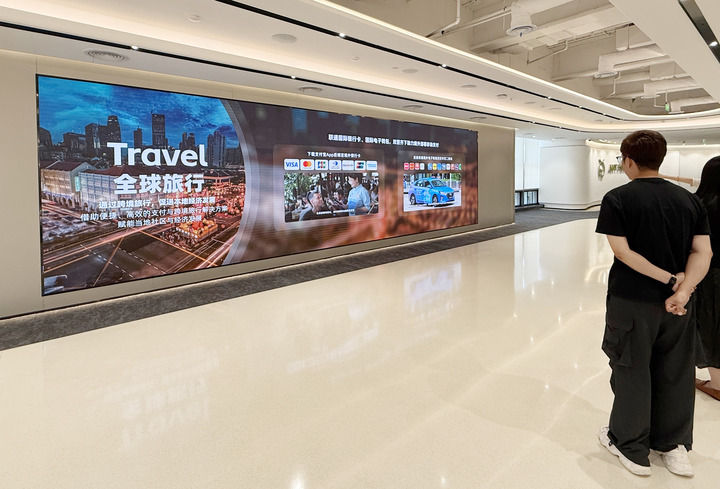 2025年7月3日,在位于上海市浦东新区的支付宝大厦,参观者在听工作人员介绍Alipay+“外包内用”和支付宝“外卡内绑”两套便利入境支付方案。新华社记者 丁汀 摄