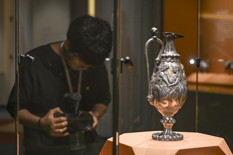 7月8日,媒体人员在上海博物馆东馆“华彩六盘·宁夏固原文物精品展”上拍摄展品鎏金银壶。 新华社发(陈浩明摄)