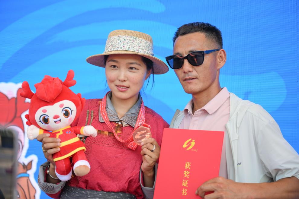 第二轮比赛,孟根陶丽的表演还在继续,但过程略有遗憾。她没能重复此前的完美表现,分别漏掉了一根白色哈达和一根蓝色哈达,最终获得该项目二等奖。