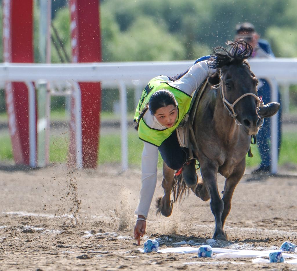 首轮比赛中,孟根陶丽第11个出场,她还是那套熟练的动作:策马、俯身、探臂,精准地拾起10根哈达,起身、再俯身、探臂,再拾起10根哈达。随着她撒落手中的哈达,现场爆发出热烈的掌声和欢呼声。
