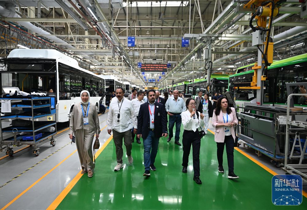 ↑ 7月24日,上海合作组织媒体智库峰会与会代表在郑州市宇通新能源厂区海外承装车间参访。新华社记者 李嘉南 摄