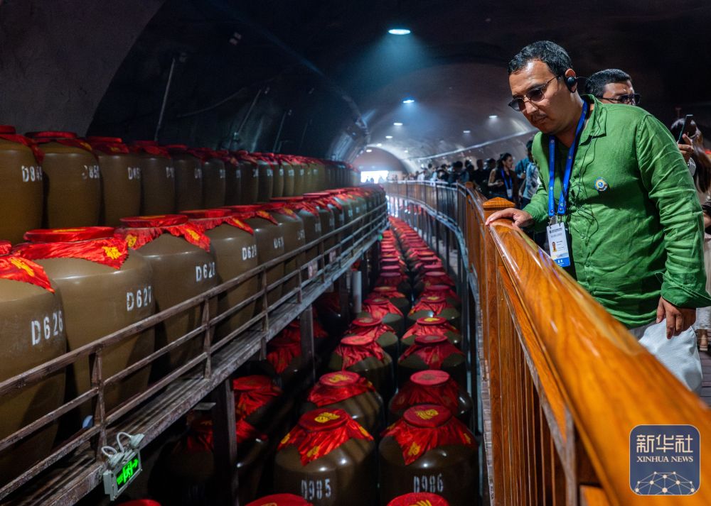 ↑ 7月23日,上海合作组织媒体智库峰会与会代表在三门峡市渑池县仰韶仙门山景区酒窖参观。新华社记者 胡竞文 摄