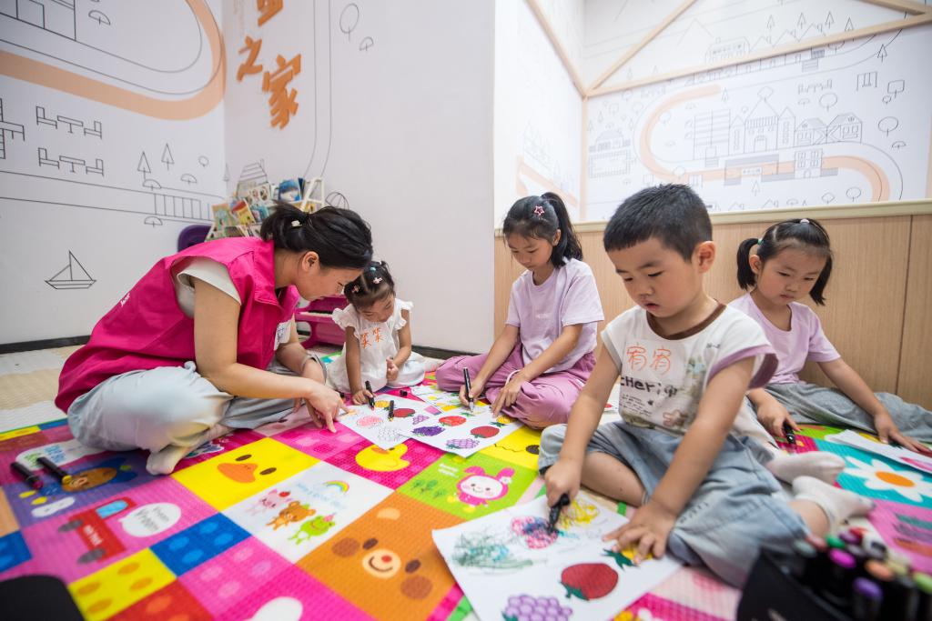 在快递小哥党群之家,小朋友们在老师的带领下玩涂色游戏。新华社记者 江汉 摄