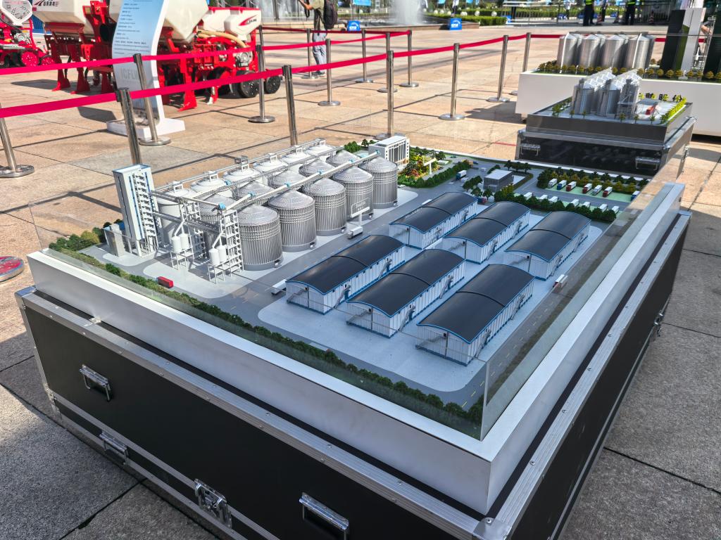 2025年国际粮食减损大会会场外展示的北京惠农工程技术有限公司烘干塔等烘储设备模型。新华社记者王鸿硕 摄