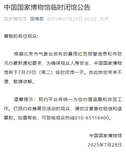 7月29日,国家博物馆发布临时闭馆通告:根据北京市气象台发布的暴雨红色预警信息和市防汛办最新通知要求,为确保观众人身安全,中国国家博物馆将于7月29日(周二)临时闭馆一天。预约平台将统一办理退票和改签工作。已预约收费展及活动的观众,请注意查收短信和退票款。如需帮助,可致电观众热线010-65116400。