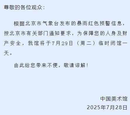7月28日,中国美术馆发布闭馆公告,根据北京市气象台发布的暴雨红色预警信息,按北京市有关部门通知要求,为保障您的人身及财产安全,该馆将于7月29日(周二)临时闭馆一天。由此给您带来不便,敬请谅解!