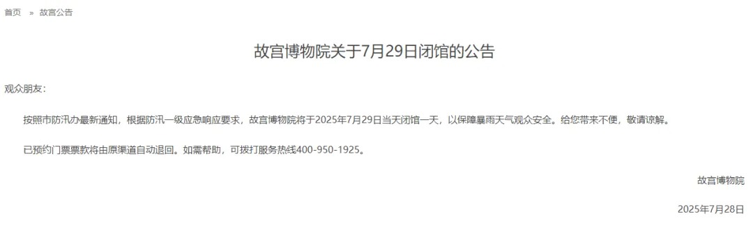 7月28日晚,故宫博物院发布公告称,按照北京市防汛办最新通知,根据防汛一级应急响应要求,故宫博物院将于2025年7月29日当天闭馆一天,以保障暴雨天气观众安全。已预约门票票款将由原渠道自动退回。如需帮助,可拨打服务热线400-950-1925。