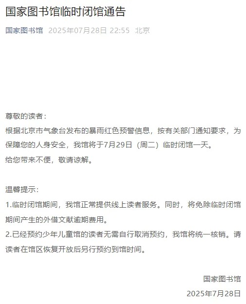 7月28日,国家图书馆发布临时闭馆通告,根据北京市气象台发布的暴雨红色预警信息,按有关部门通知要求,为保障您的人身安全,该馆将于7月29日(周二)临时闭馆一天。给您带来不便,敬请谅解。