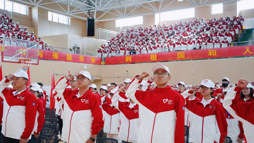 7月29日,2025年大学生志愿服务西部计划服务西藏专项志愿者出征仪式上,志愿者们正在宣誓。 陈枭 摄