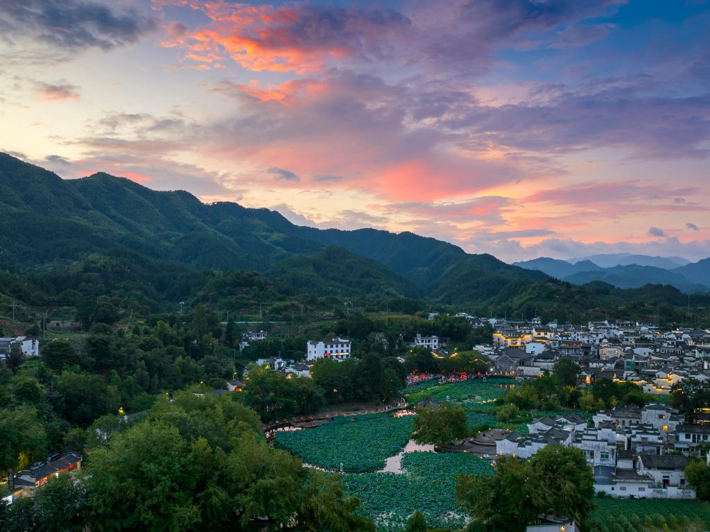 这是7月25日傍晚在安徽省黄山市徽州区呈坎村拍摄的风景(无人机照片)。新华社发(樊成柱 摄)
