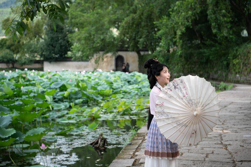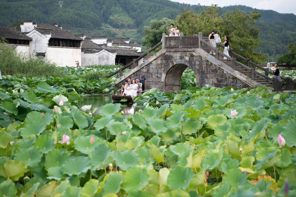 7月25日,在安徽省黄山市徽州区呈坎村,游客在永兴湖畔留影。新华社记者 张端 摄